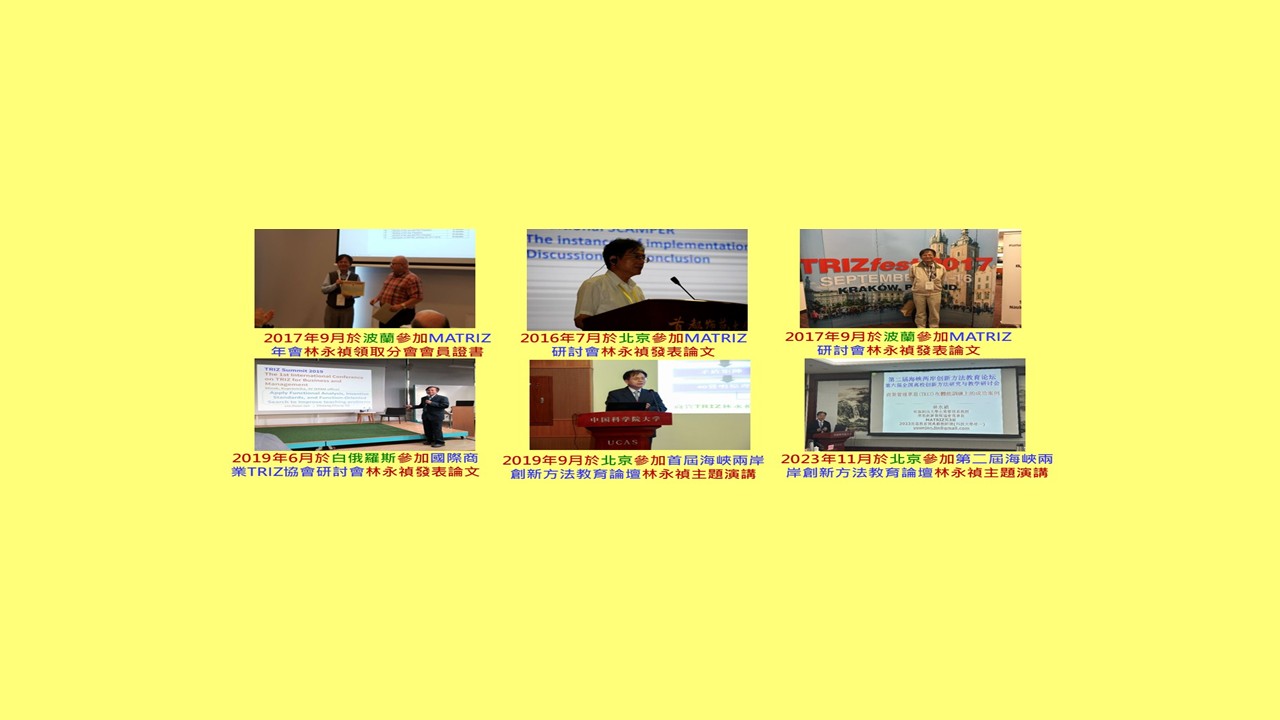 • 2016,我在北京的 MATRIZ 年會 (TRIZfest-2016) 上發表了論文,主題是將 TRIZSCAMPER 整合,形成更全面的創新方法 2