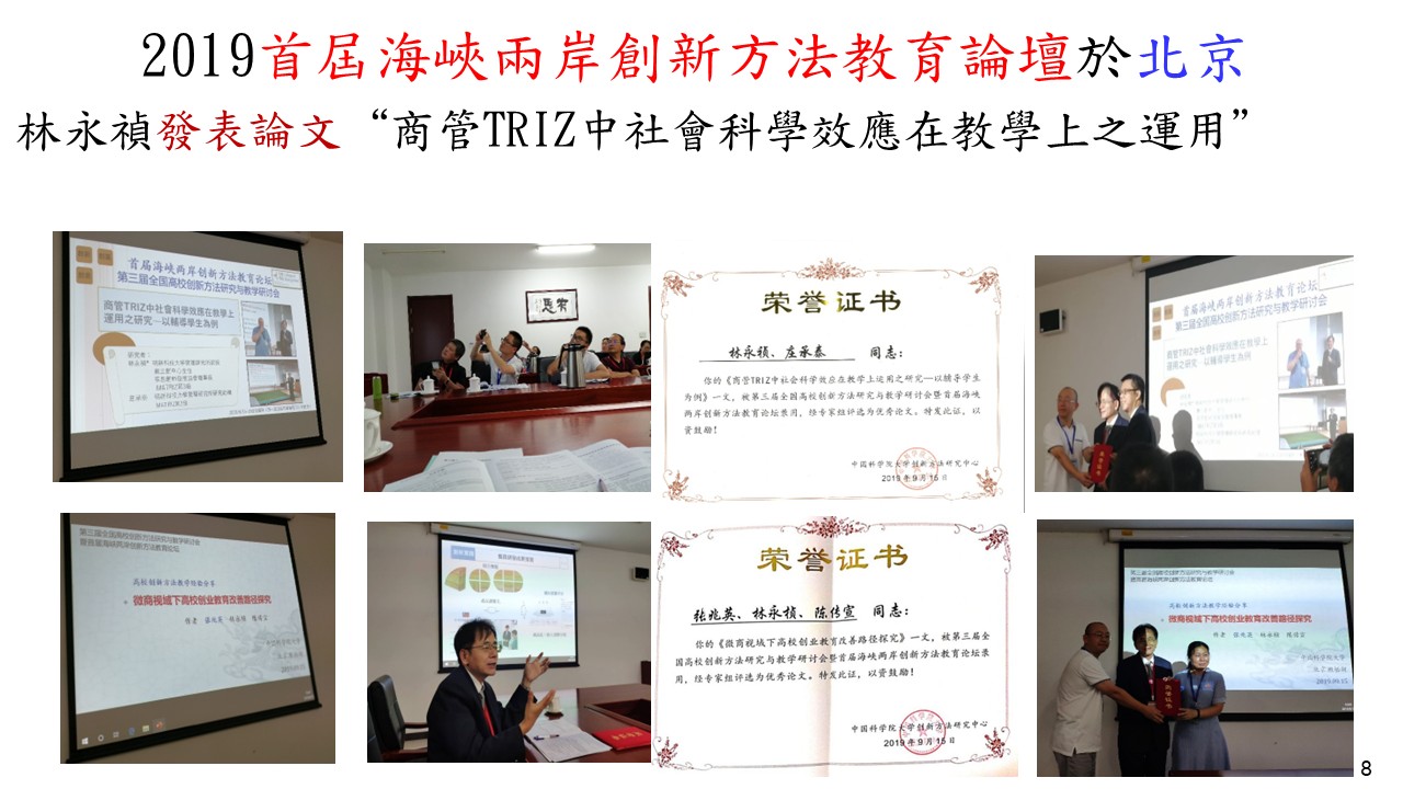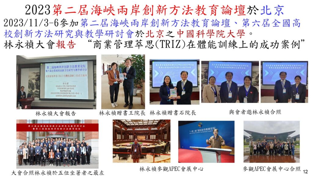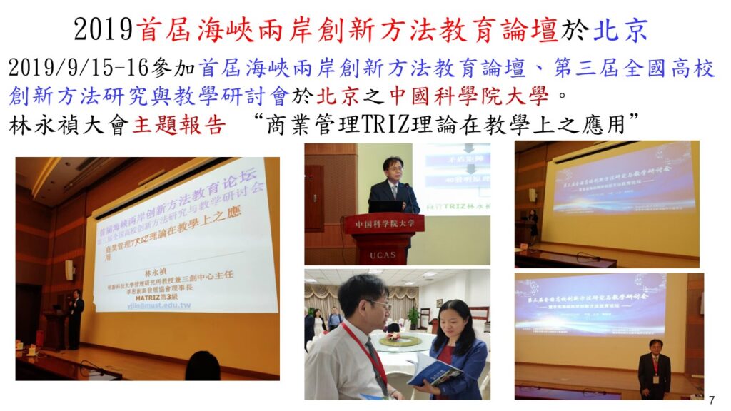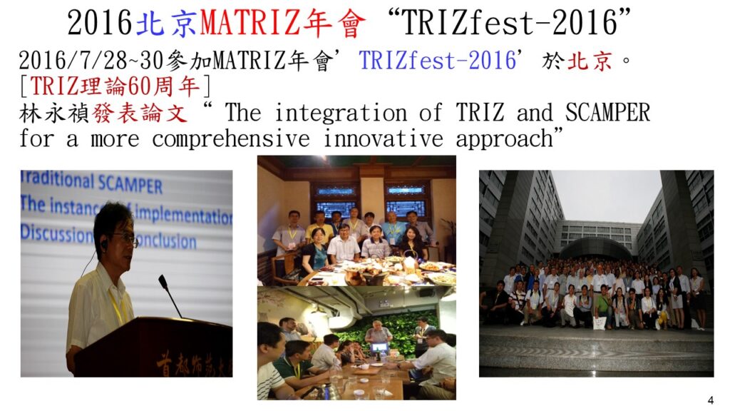 2016/7/28~30參加MATRIZ年會’TRIZfest-2016’於北京。[TRIZ理論60周年]林永禎發表論文“ The integration of TRIZ and SCAMPER for a more comprehensive innovative approach”
