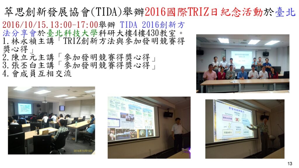 ◆ 持續耕耘:能見度提升與展望也許,是這份對 TRIZ 的熱愛與堅持,感動了上天吧!隨著時間過去,萃思創新發展協會 (TIDA) 在國內外的能見度逐漸提高,越來越多人開始關注並參與我們的創新方法分享會。我們的活動從單一場次擴展到跨縣市的多場次,參與的協辦單位也包含了明新科大、台北科大、台灣科大等學術機構。經過這段差點被迫停辦活動的過程,我更加珍惜每一次能夠與大家相互交流 TRIZ 理論知識與實務應用經驗的機會。